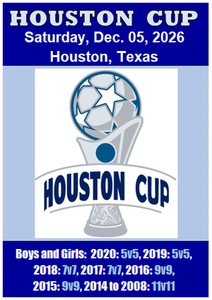 5v5 FC Houston Cup Sundav5y Feb-28, 2016 (1 day only) For Information, click ![]() Youth Divisions: U06 to U19 (Jan 1 calendar year) Also Adult Div. (Men and Women). Winners get Trophies and advance to the State Championship |